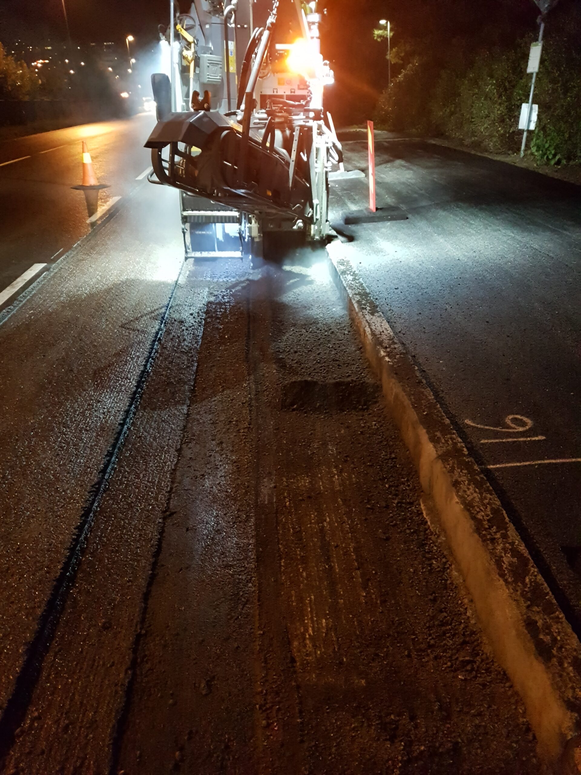 Eksisterende Kantstein skal fjernes. Asfalt på repo fjernes. Asfalt skjæres og fjernes 1,1 m fra kantstein. Belegg i rabatt mot Elektroimportøren må tas opp og resettes på ny høyde. Ny kantstein settes, betong stein mot skillerabatt (elektroimportøren). Flatene asfalteres med nytt fall og det settes opp et nytt lehus på begge lommene.