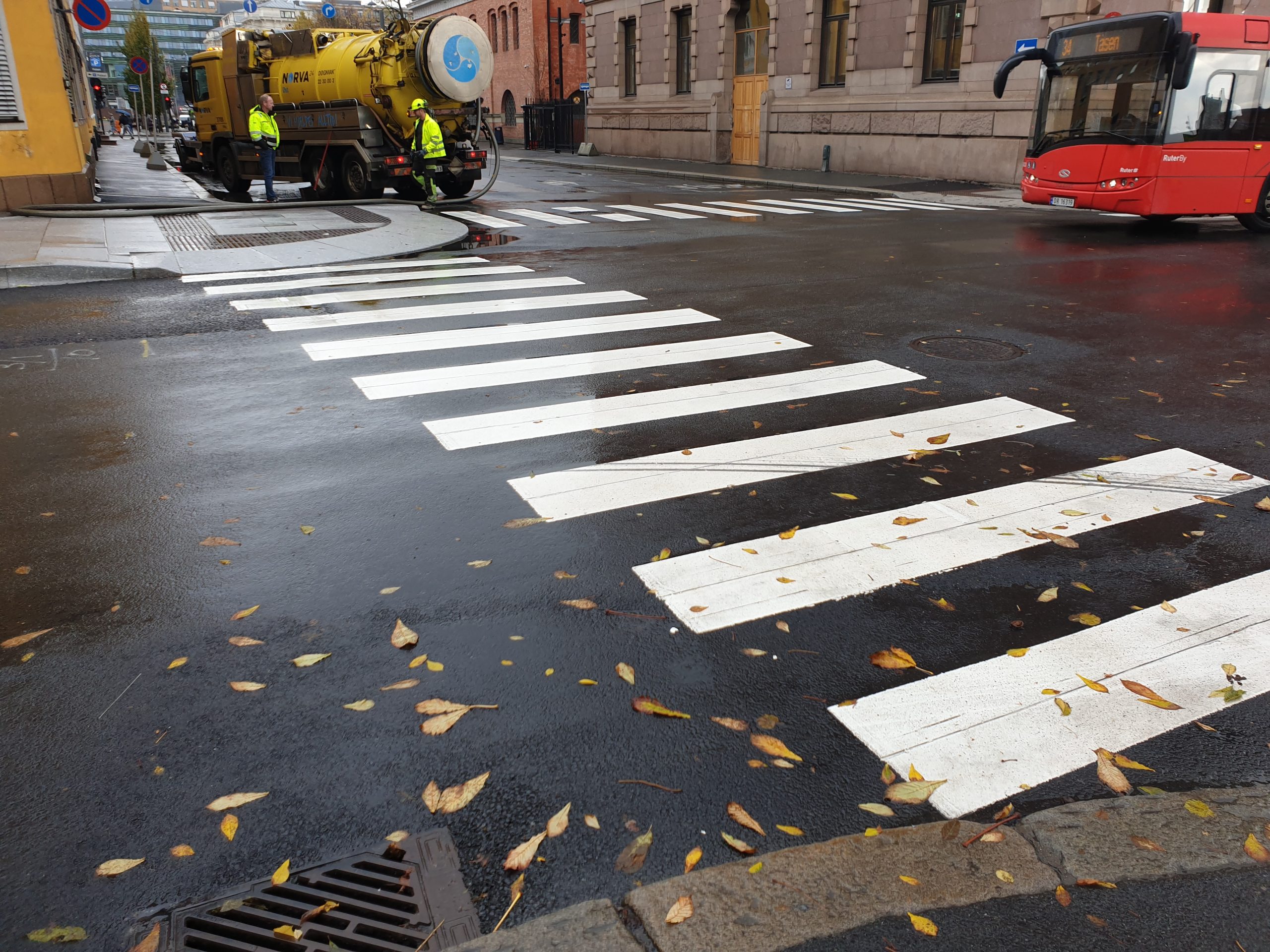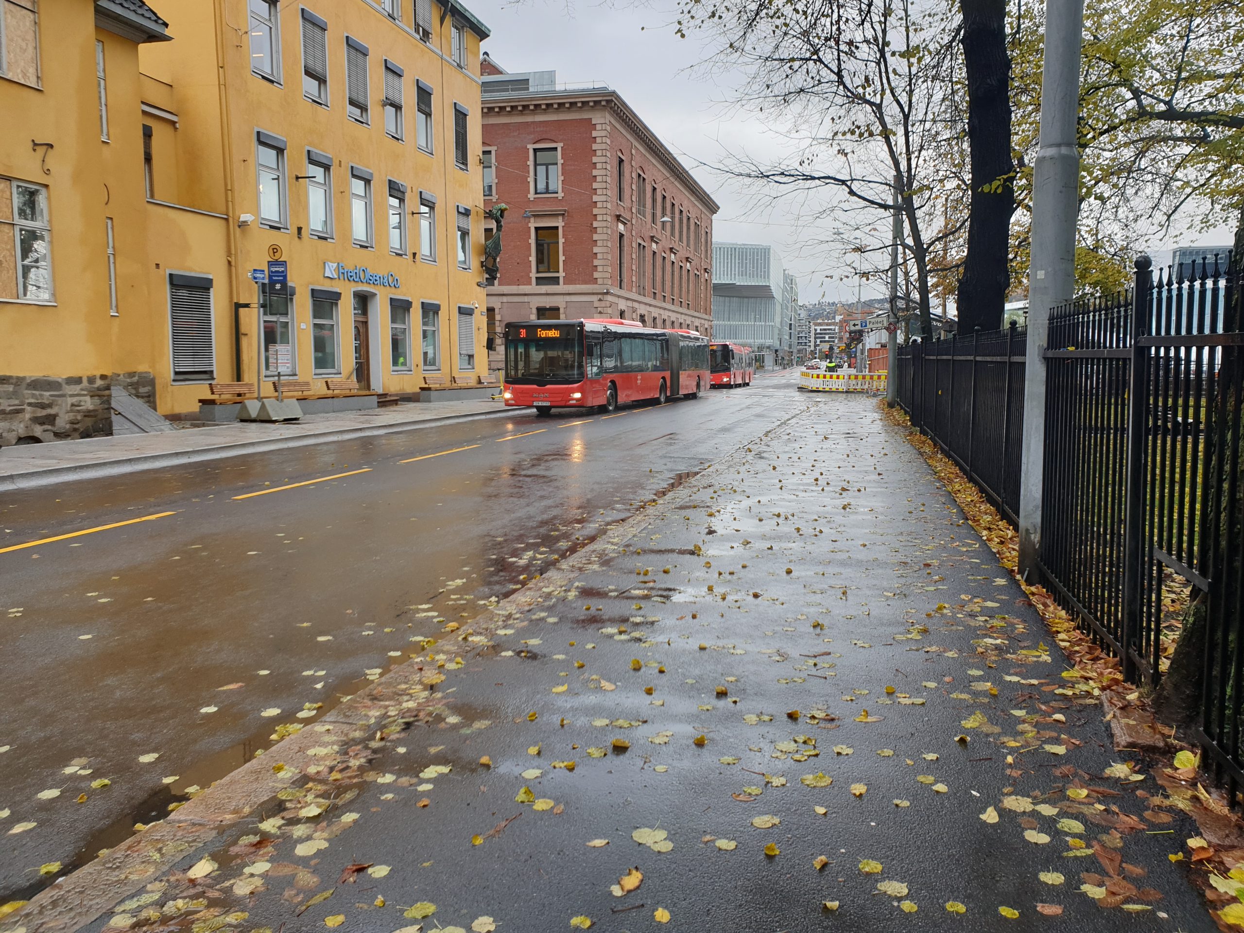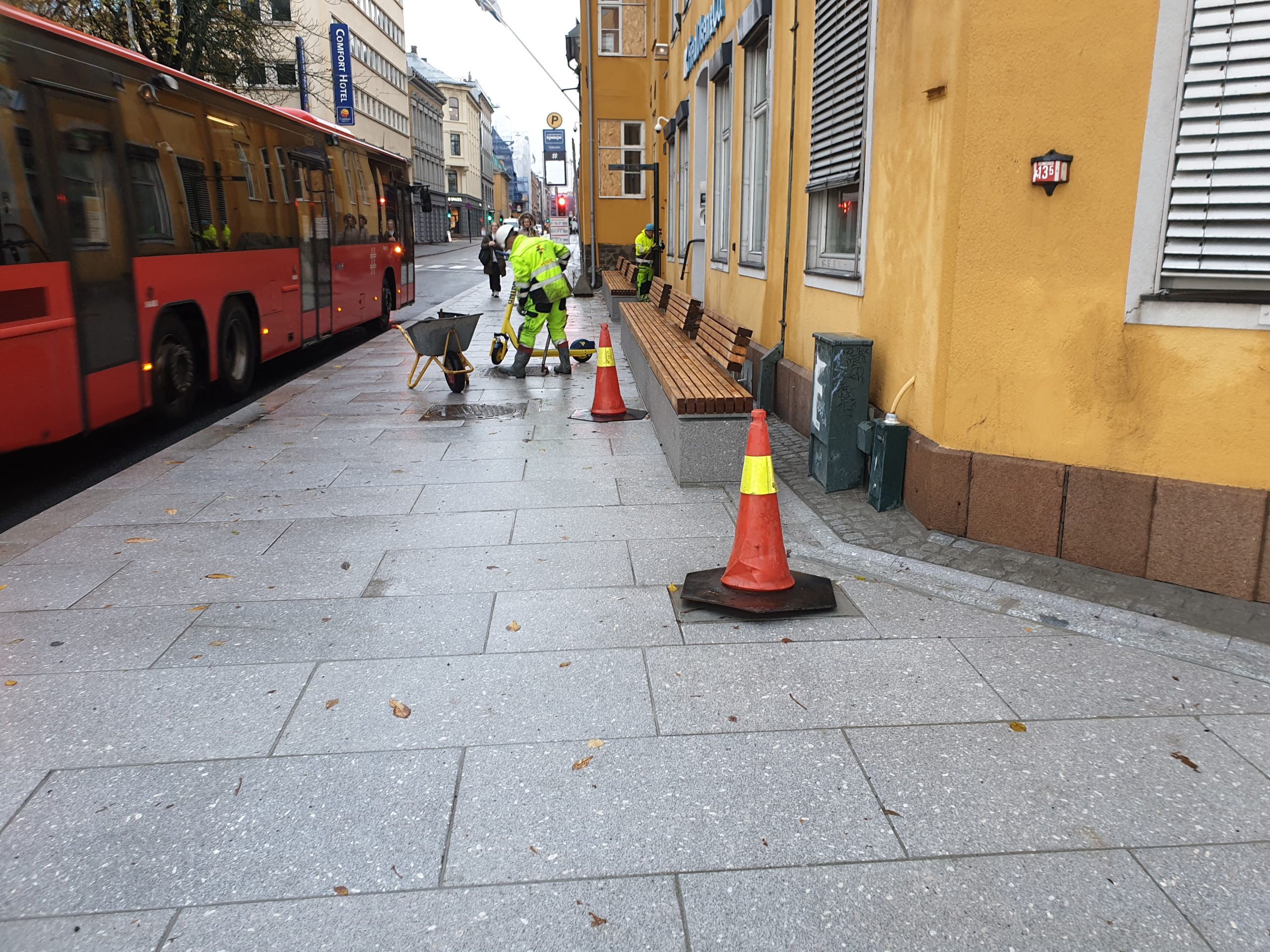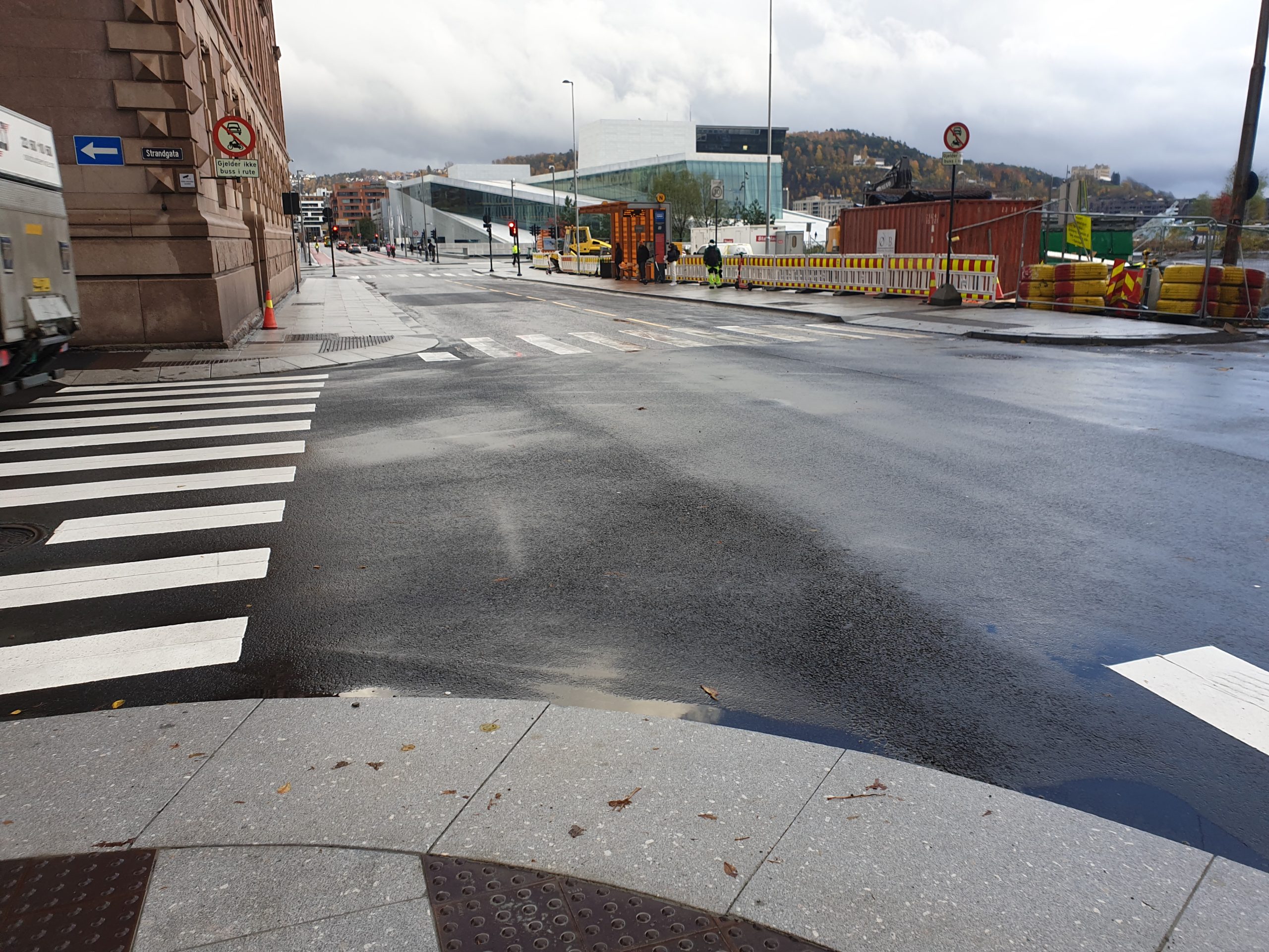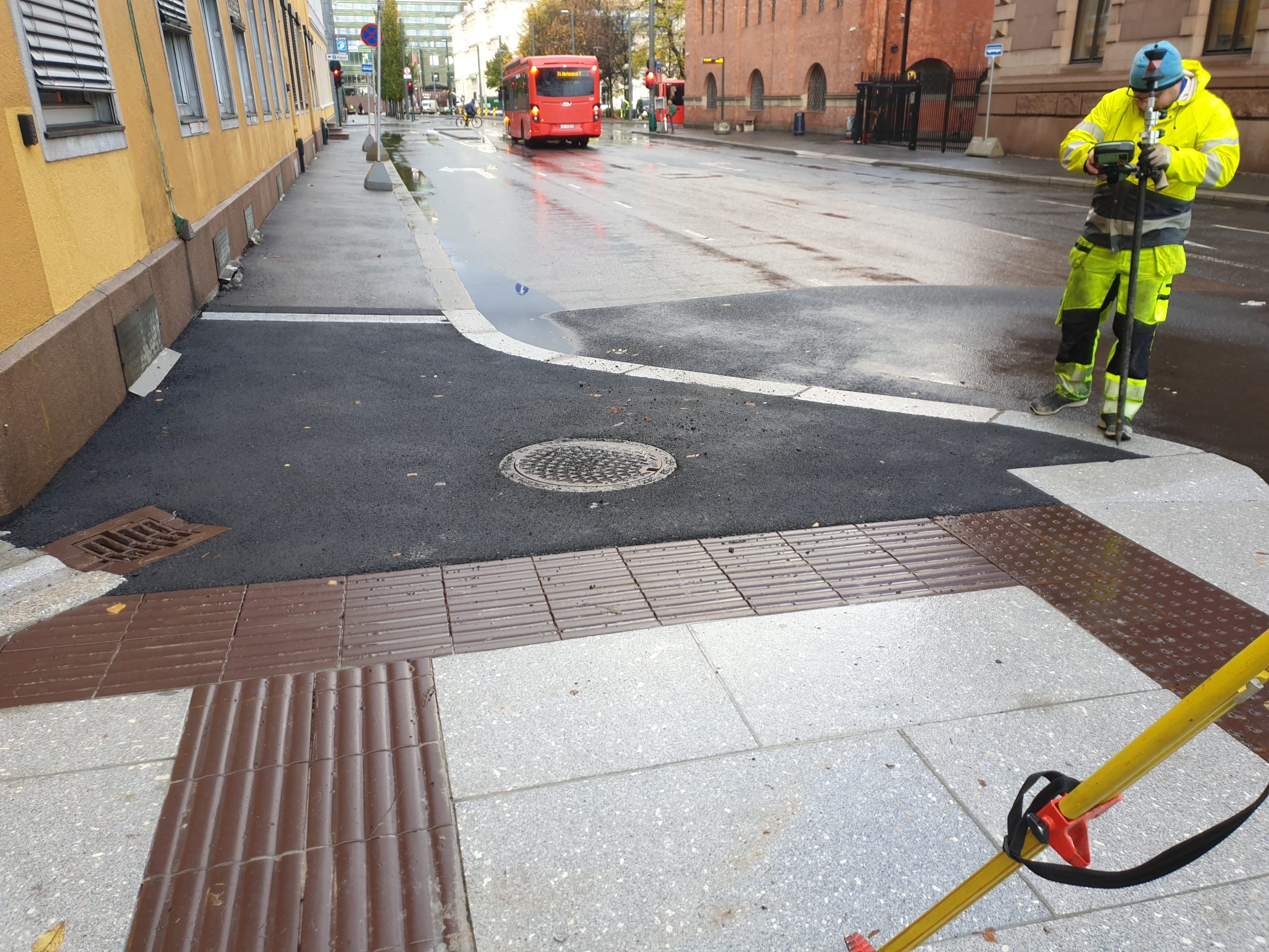 Tollbugata holdeplass: Arbeidene med holdeplass for vestgående retning i Tollbugata 1B ved Treschowbygningen (Fred. Olsen) er i stor grad overflatearbeider, men det skal etableres overvannssystemer for håndtering av takvann og annet overvann samt SIS galge med fundament. Fortauet skal etableres med granittsteinsheller