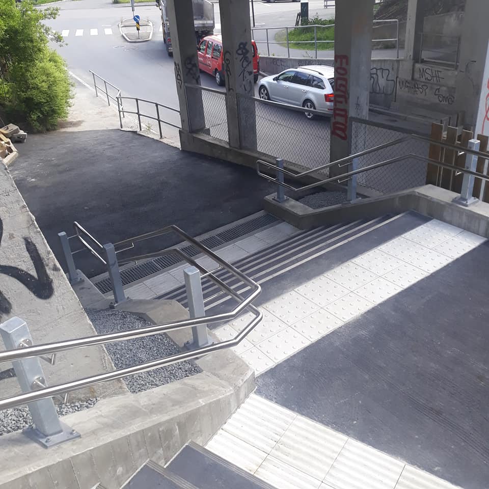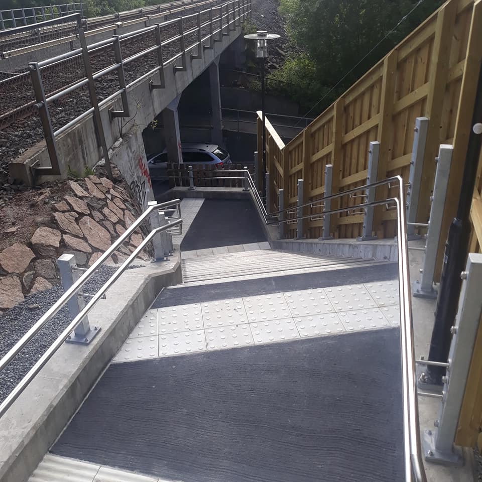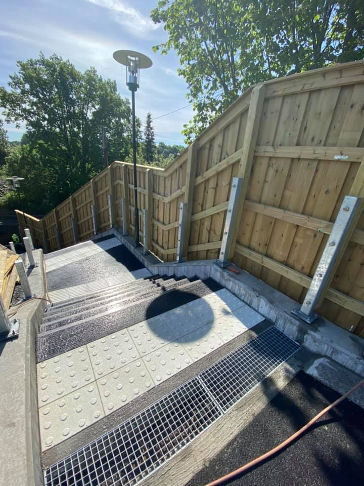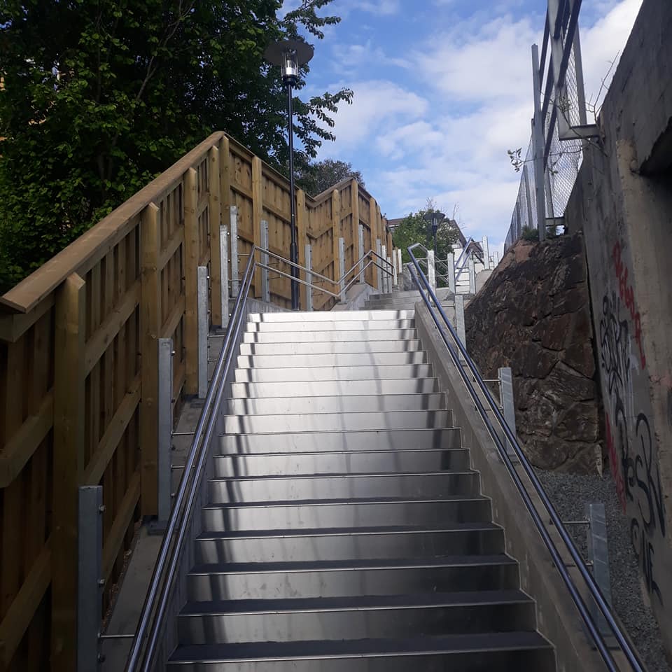Anlegget omfatter utskifte av prefabrikkert støttemur mot banetrase, asfaltlegging av gangvei, oppsett av lysmaster, kantsteinsarbeider og konstruksjonsarbeider med oppgradering av trapp.