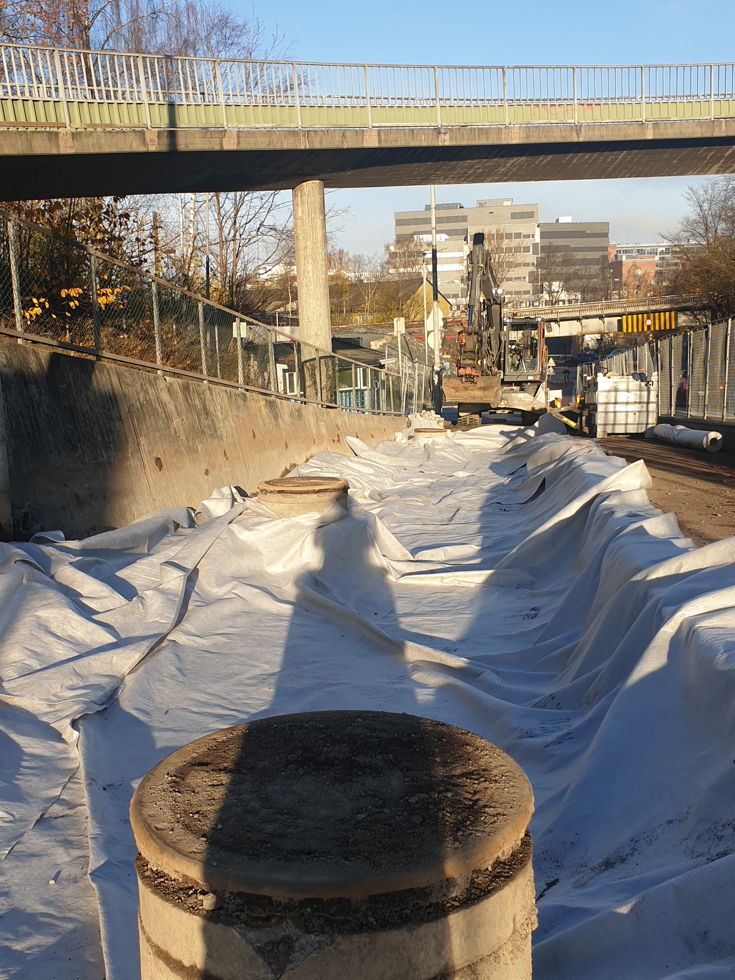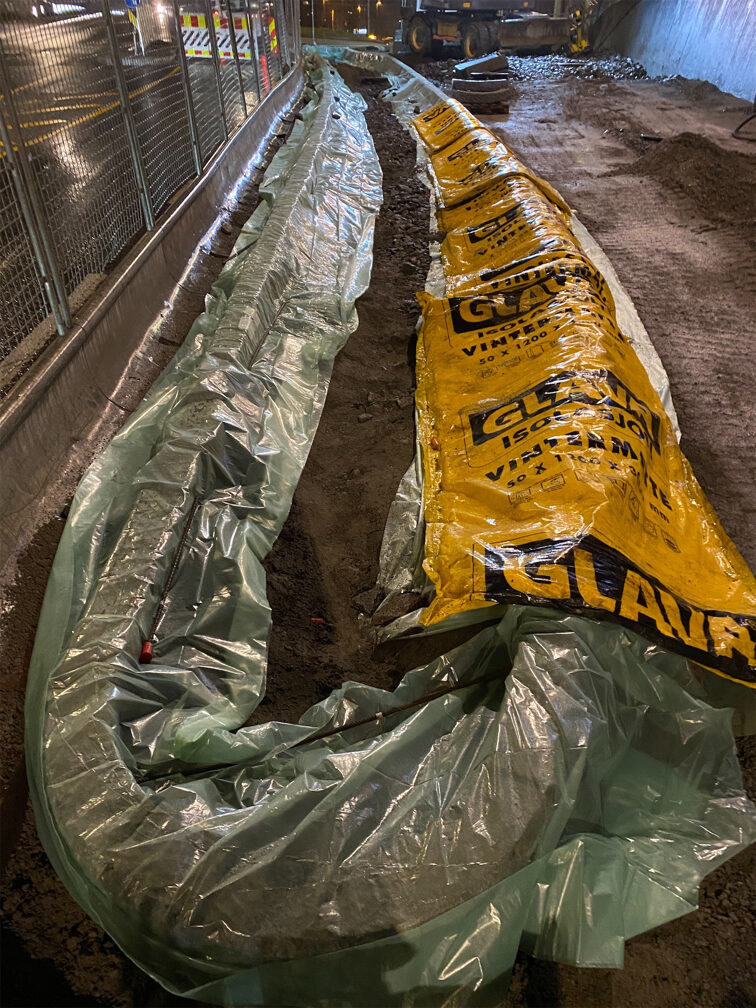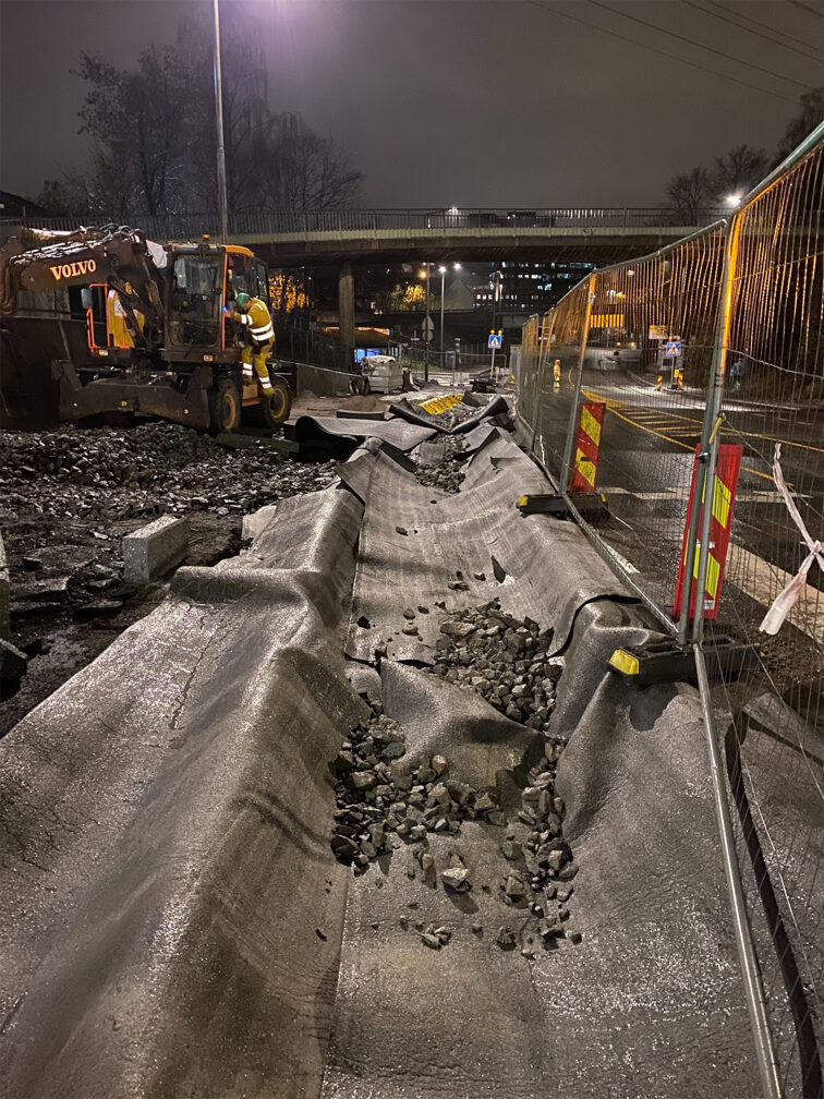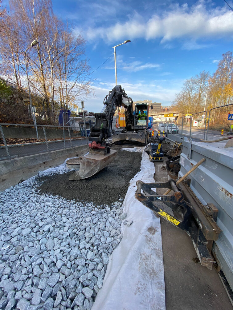 Det skal oppføres to ikke overkjørbare rabatter på hver side av rampa mot ring 3. Rabattene skal steinsettes med storgatestein i granitt. storgatesteinene skal tilpasses mot eks. vannkum med tett lokk i dagens eksisterende sykkelfelt.